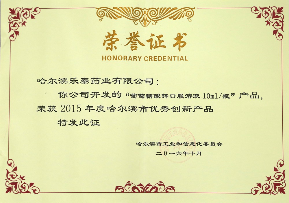 【乐泰讯】2016年10月哈尔滨市工业和信息化委员会授予我公司“复方聚维酮碘搽剂 3ml/瓶”、“葡萄糖酸锌口服溶液 10ml/瓶”两个产品为2015年度哈尔滨市优秀创新产品称号。